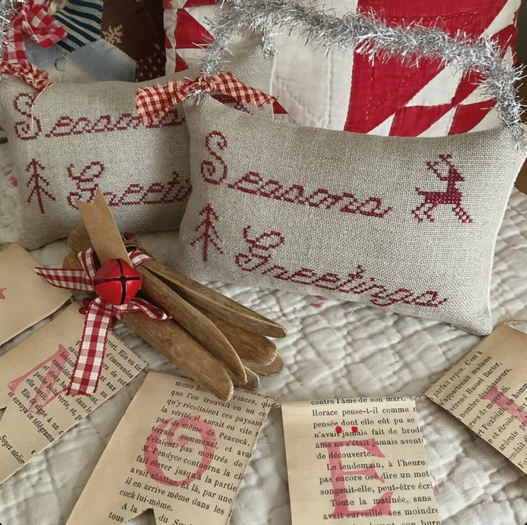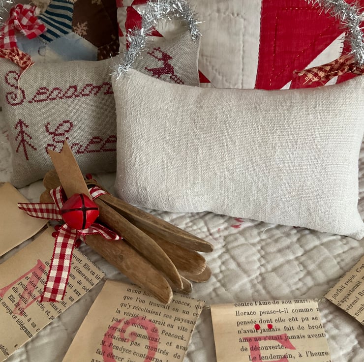 A small decorative piece to tuck on to a shelf, fill a bowl, or hang on a tree, branch or peg rail. The tinsel hanger is trimmed with a homespun fabric tie.