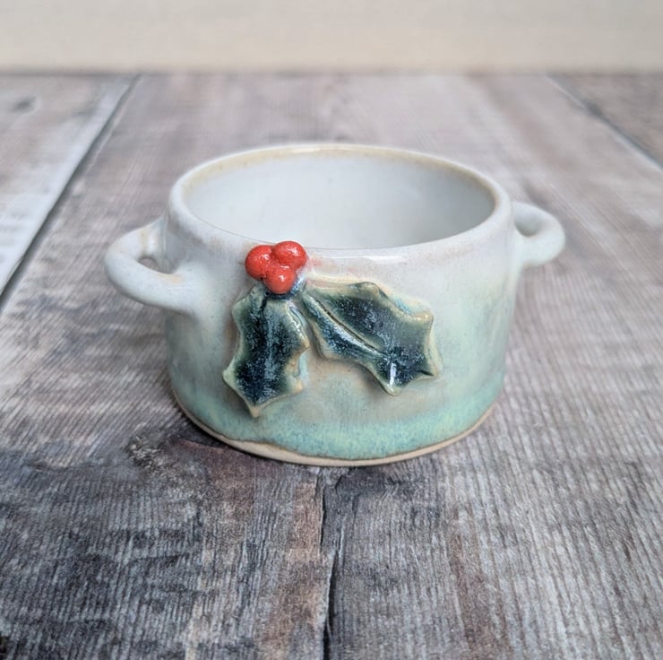 A ceramic tealight thrown on the wheel in stoneware clay. It is glazed a lovely tonal white which flows into turquoise near the base. Hand sculpted holly is on the front and two small handles either side (may get hot when in use). Candle not included.
