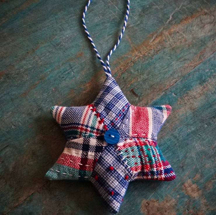 Add a touch of rustic charm to your holiday decor with this handmade patchwork start ornament. Carefully crafted from vintage Chinese fabrics, each star is one of a kind, featuring a harmonious mix of textures, patterns and colours. This 11.5cmH x 10.5cmW star ornament is stuffed with fibre filling and the simple hand stitches add extra rustic charm to it. It's perfect to be hanged on your Christmas tree or anywhere you want to bring in some festive feel.