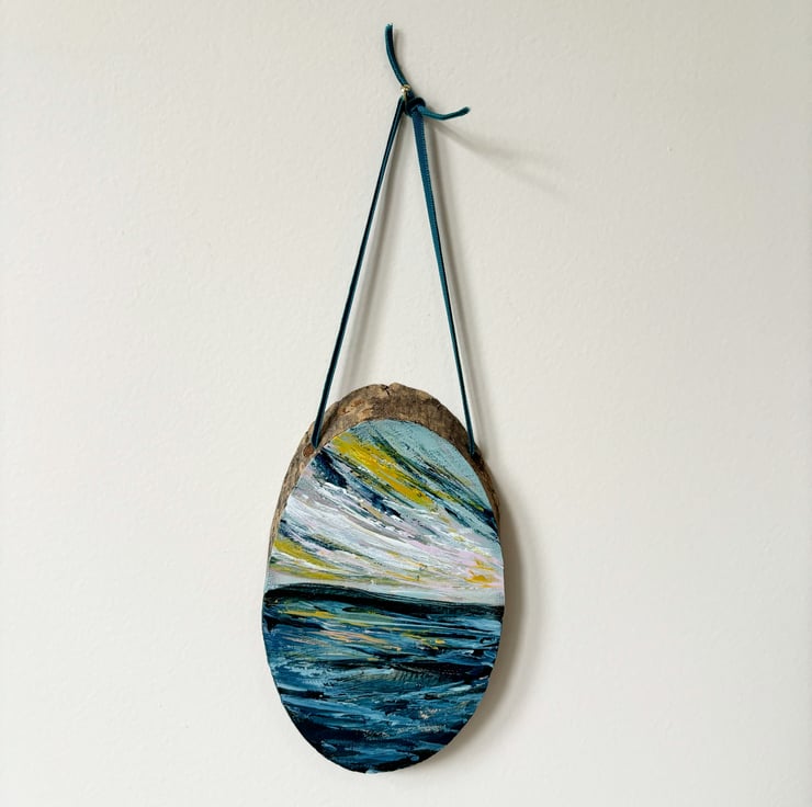 Original Seascape Hanging Wooden Log Slice entitled 'Balance'. Hand painted in acrylic with teal velvet ribbon so it's ready to hang.