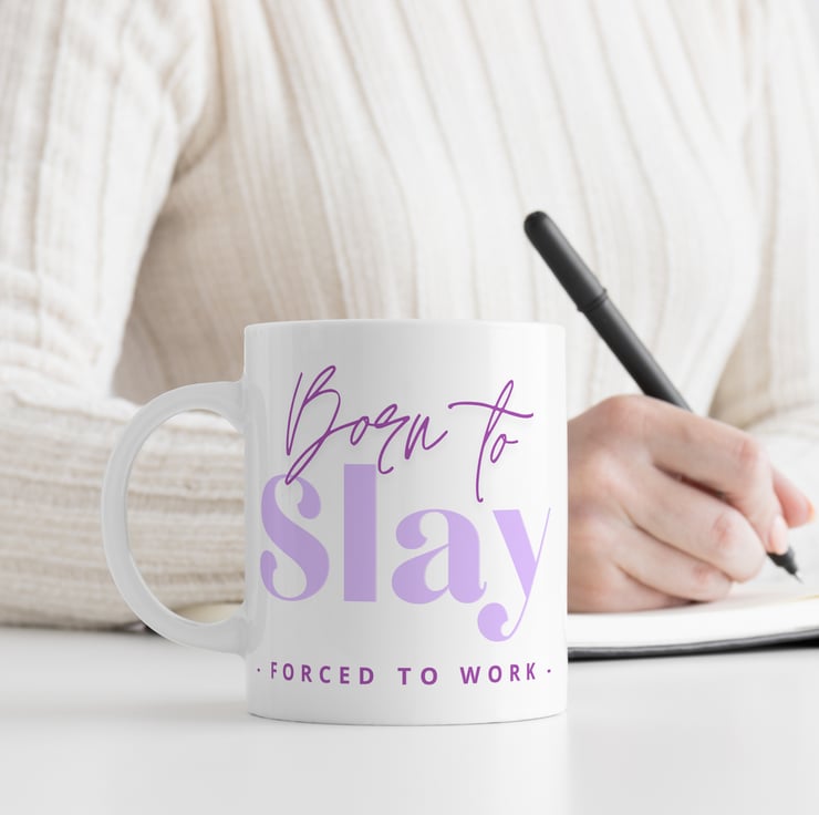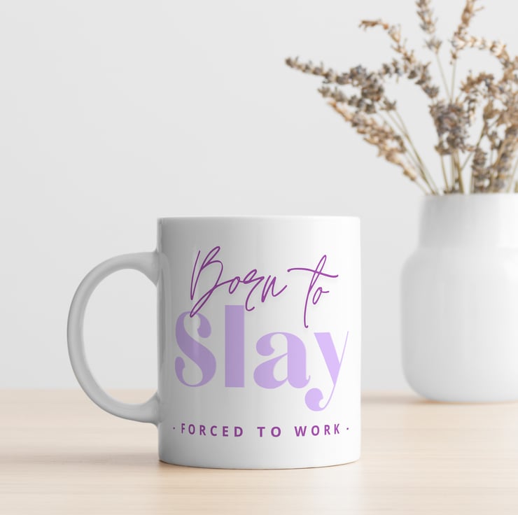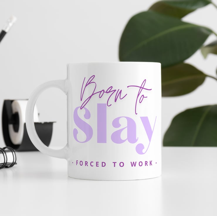 Stay stylish even on the busiest workdays with this sleek "Born to Slay, Forced to Work" mug! Featuring a modern, minimalist font, this design is perfect for coffee lovers who appreciate chic and subtle humour.