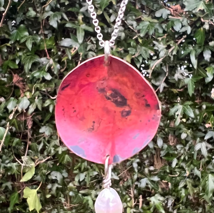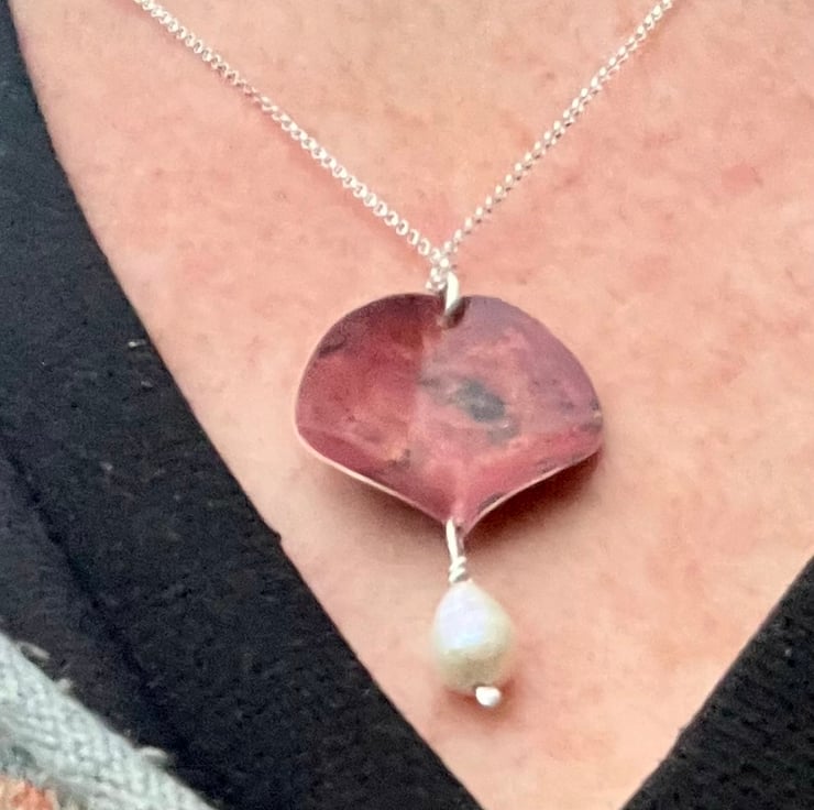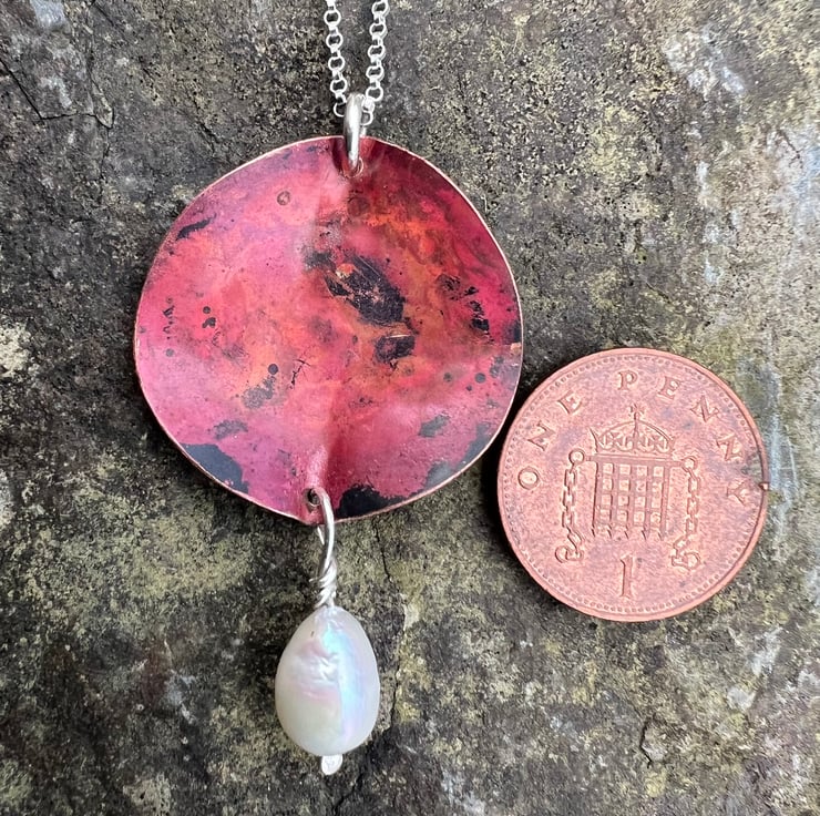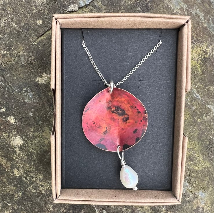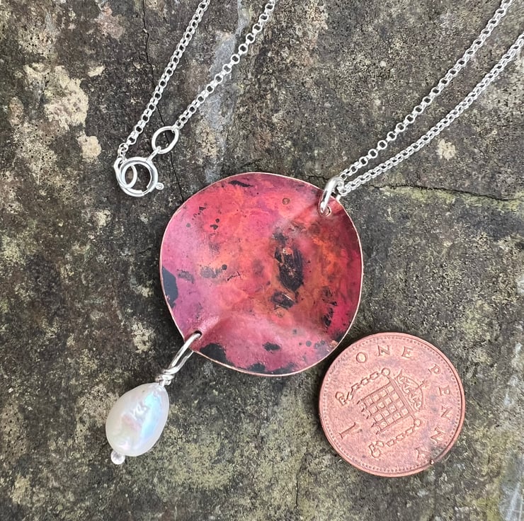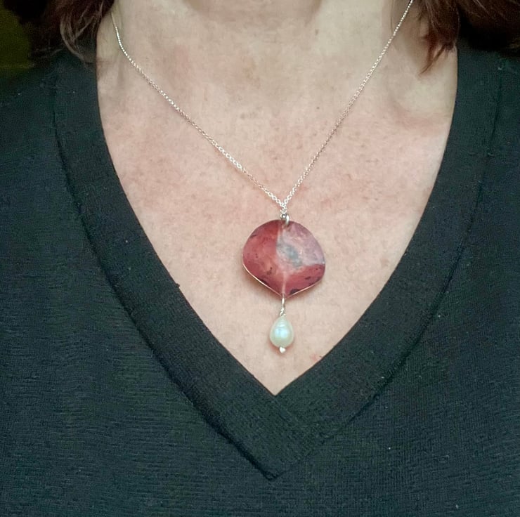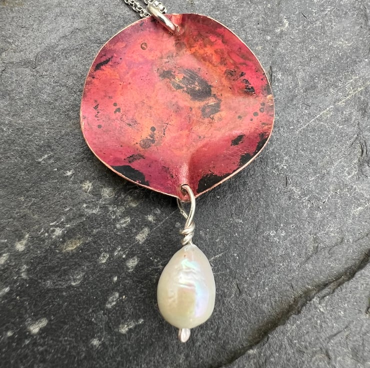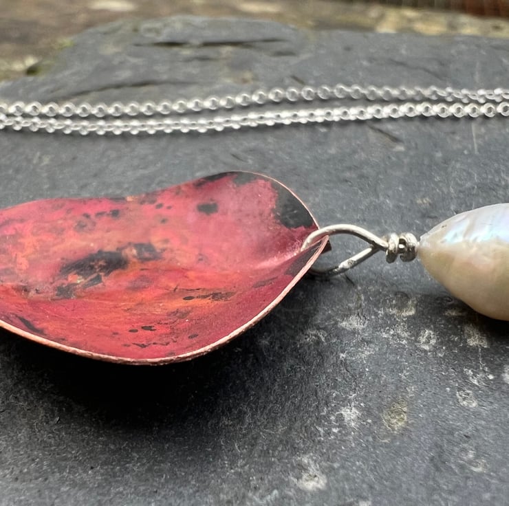 Statement necklace made from copper with a large freshwater pearl dangle .The copper has been sculpted into a 3D leaf shape from which a pearl is hanging . The deep and luscious red tones have been achieved using heat and are preserved with a penetrating , finishing wax.