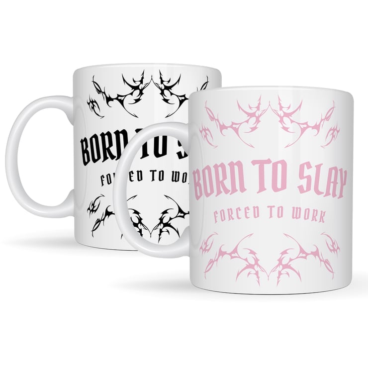 Unleash your inner rebel with this bold "Born to Slay, Forced to Work" mug featuring a striking neo-tribal design. Perfect for those who love edgy aesthetics and a strong dose of caffeine, this mug makes a statement on every desk.