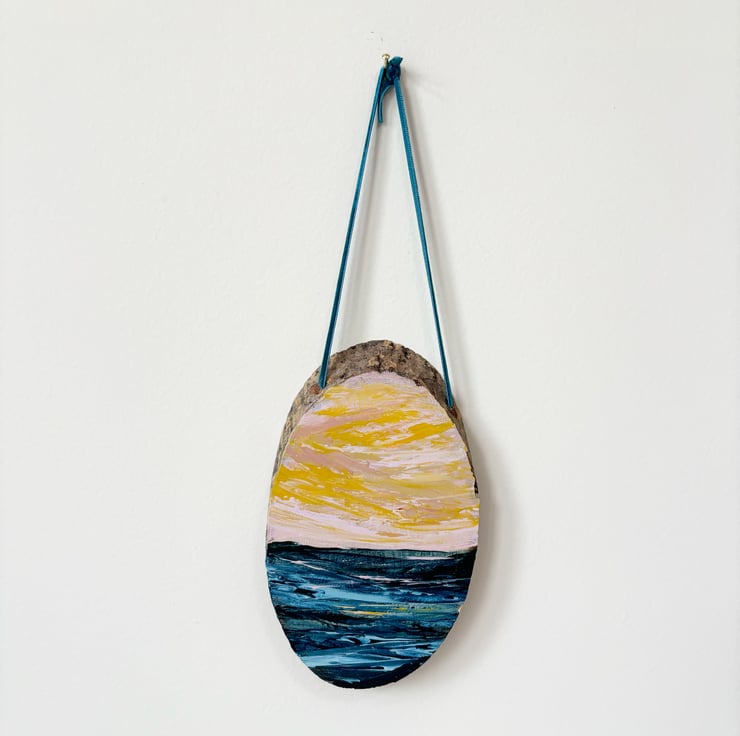 Original Seascape Hanging Wooden Log Slice entitled 'Bliss'. Hand painted in acrylic with teal velvet ribbon so it's ready to hang.