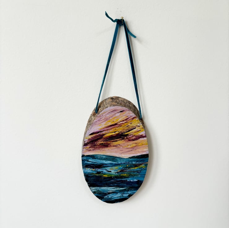 Original Seascape Hanging Wooden Log Slice entitled 'Magic'. Hand painted in acrylic with teal velvet ribbon so it's ready to hang.