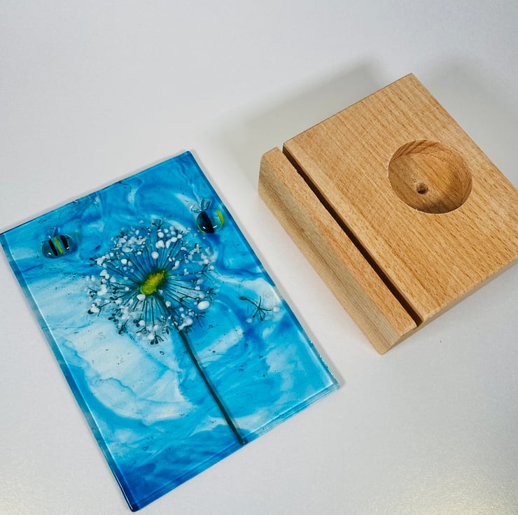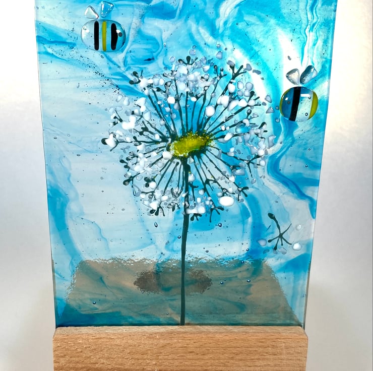 Gorgeous fused glass dandelion and fused glass bee panel that d add life’s into an oak base and has a carded placement for a t light . The da ndeluon and bees are each fused separately then all together for a final fuse .