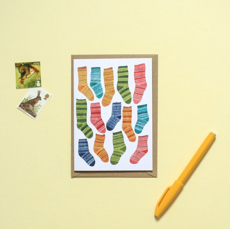 This greeting card features my illustration of colourful socks and is printed in the UK on thick, matt white recycled card stock. Perfect to send to a knitter or crafter and a cheerful way to say 'hello' or 'happy birthday'.