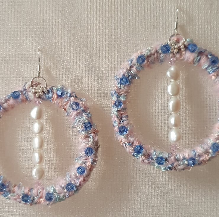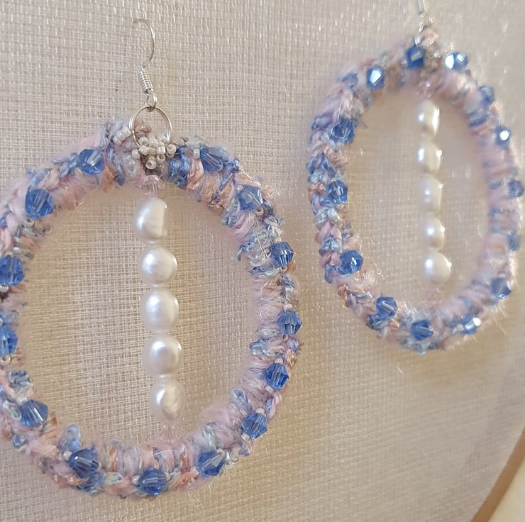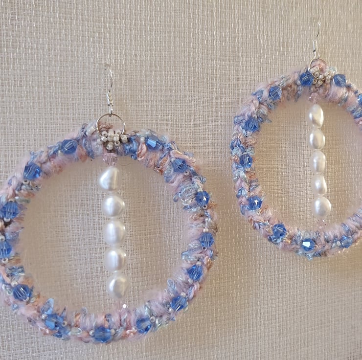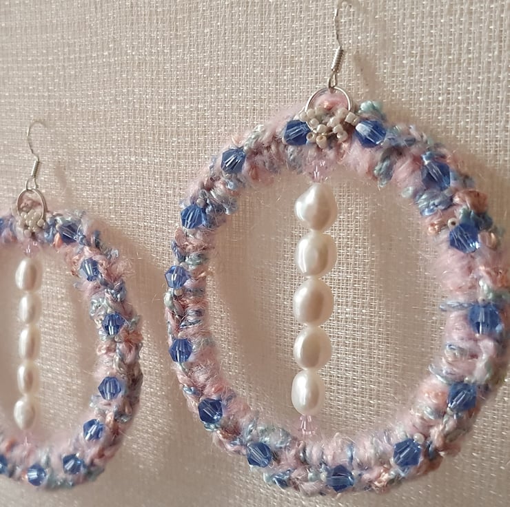 Really pretty and light substantial freshwater pearl earrings with pastel mohair, swarovski beads, sterling silver findings and hand shaped wire hoop.