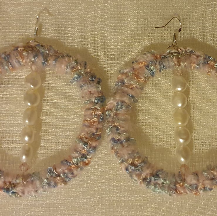 The vintage silk mohair is soft and easy on the eye, the pearl and swarovski bead strand through the centre stands out without compromising the outer silver coated wire circle. Sterling silver earring wires for all day comfort.