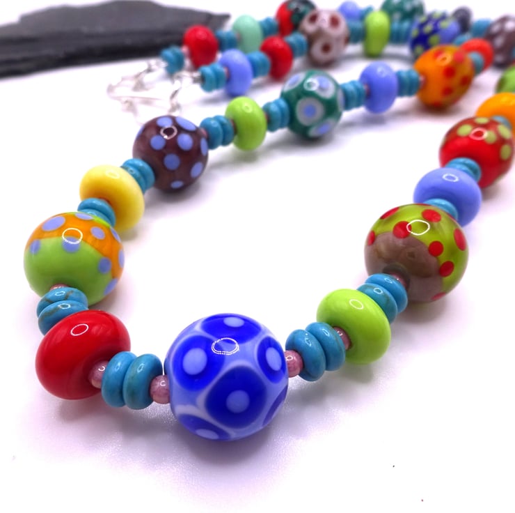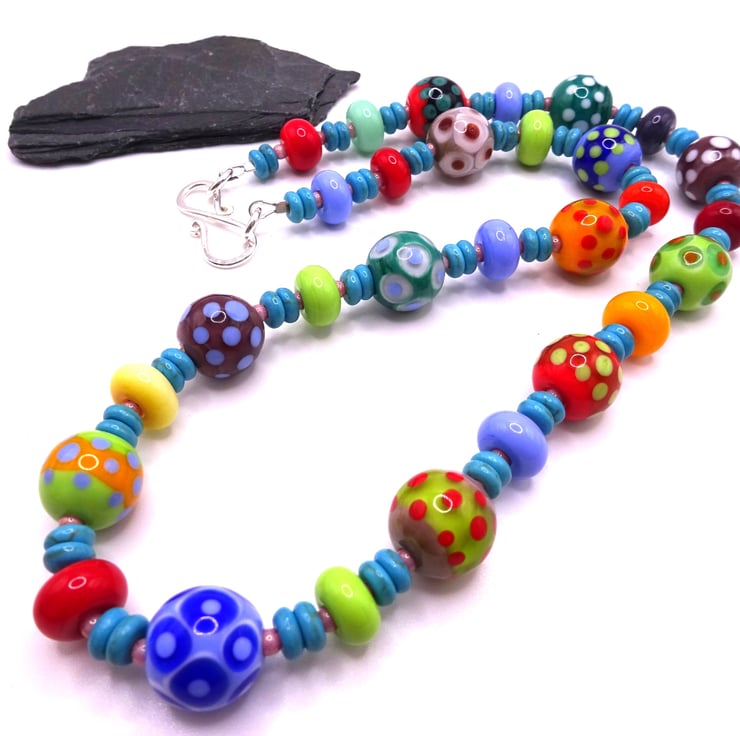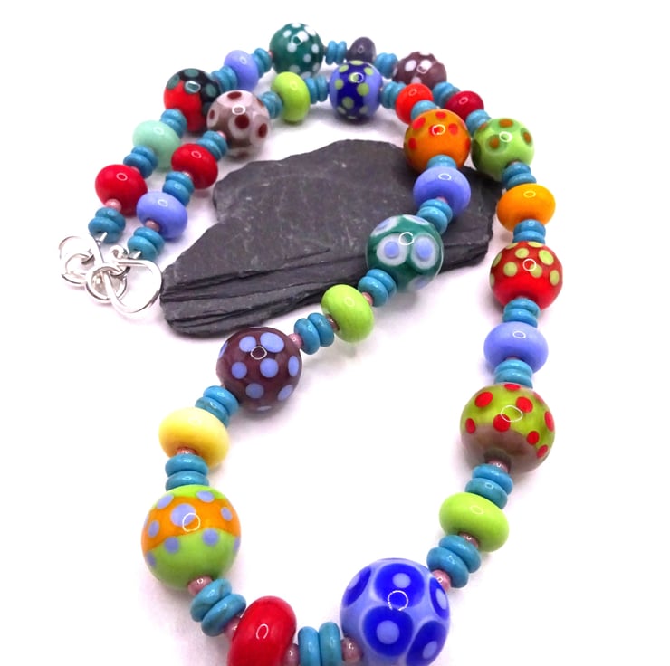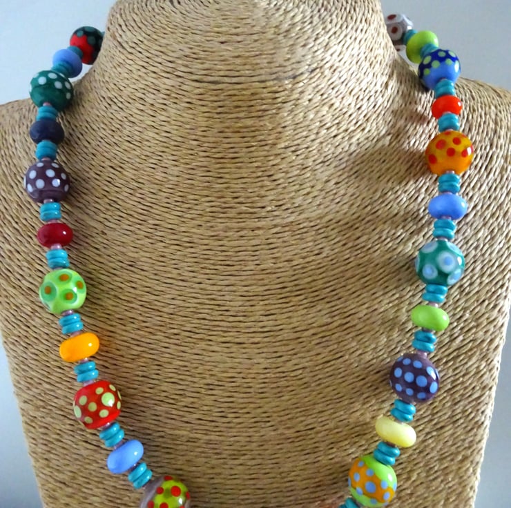 A necklace made using handmade lampwork glass beads in various colours and blue howlite discs.
