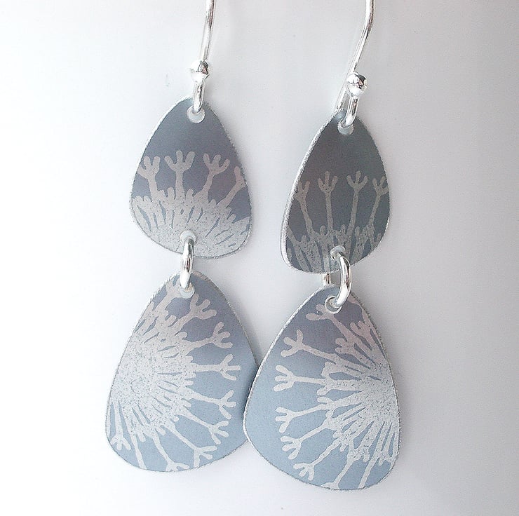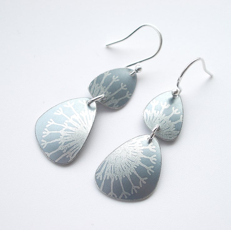 These mid century inspired earrings are made from anodised aluminium which I have dyed in grey and printed with a seed head design. I cut the pebble shapes by hand using a jeweller’s saw and file the edges to give a nice smooth finish. Finally I dome the pebble shapes so that they catch the light.
