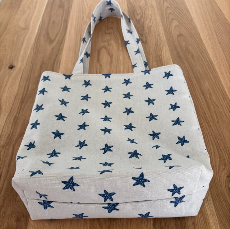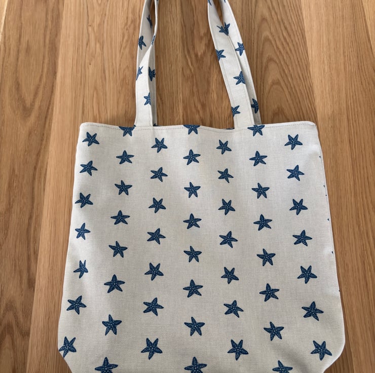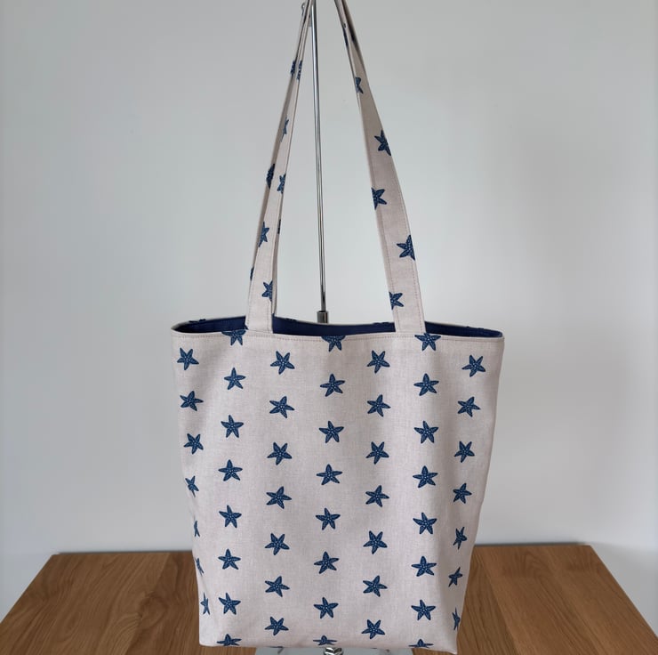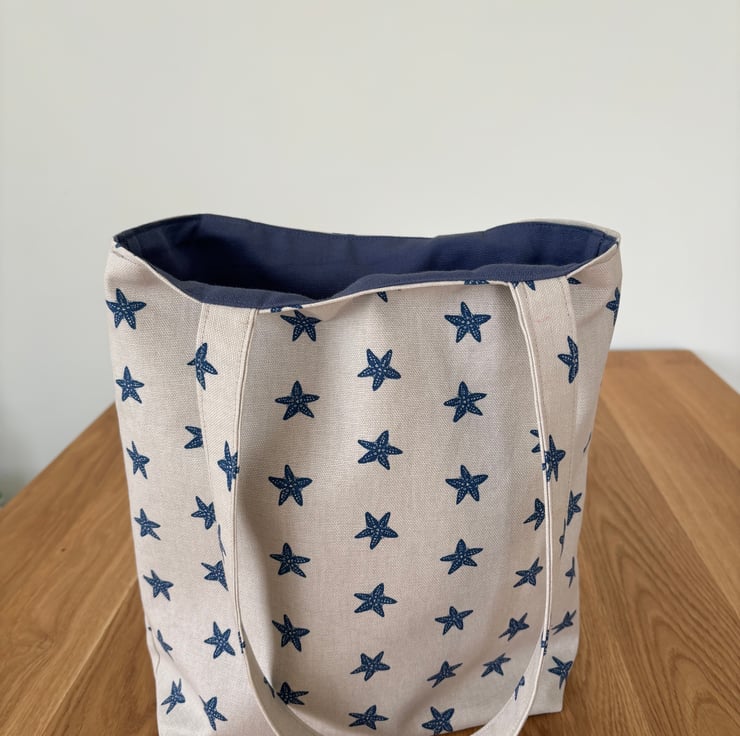 Handmade tote bag in 100% cotton fabric with a print of blue starfish on a taupe background, lined with a coordinating plain cotton in blue. A lovely fresh, crisp design for a touch of the seaside all year round.
