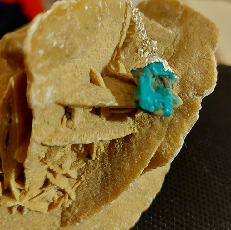 This gorgeous raw Turquoise nugget has been capped in sterling silver, hangs from a 16-18 inch adjustable sterling silver belcher chain (there is an option to choose 18-20 on checkout). The simple beauty of the crystal is maximised in this format. Each is individual and are approximately 1.5 - 2cm in length.