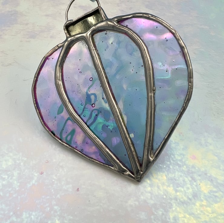 A sparkling blue stained glass Christmas bauble with a silver mirrored top and loop. This light blue glass is slightly rippled emphasising the iridescence of this very special glass.