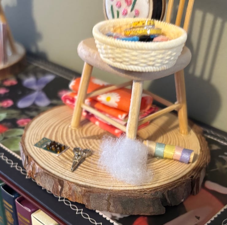 A delightful 1:12 scale miniature chair with tiny embroidery hoop and a basket of thread. A perfect little gift for a lover of embroidery and sewing.