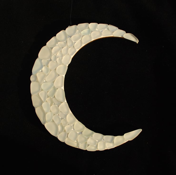We've made this fabulous crescent moon hanger from tumbled sea glass. The glass has come from old bottles, and has been rounded by the waves. This gives the surface of the hanger a three-dimensional effect, and the finely frosted glass picks the light up beautifully. The back of the hanger is top quality laser cut plywood.
