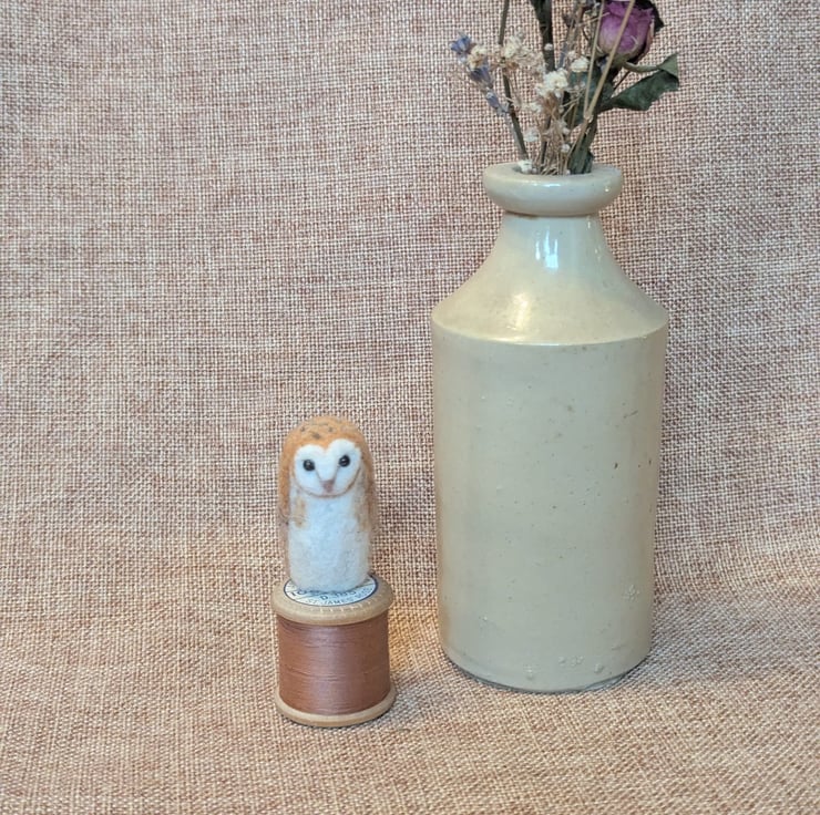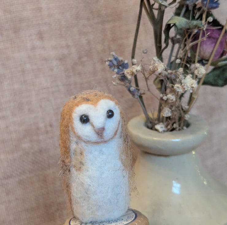 The barn owl is made using the needle felting technique which uses a barned needle to tangle and bind the fibers.