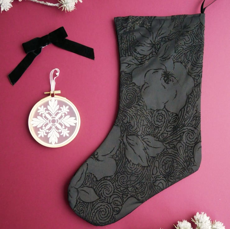 Large black Christmas stocking with flocked poinsettia design and gold glitter effect.