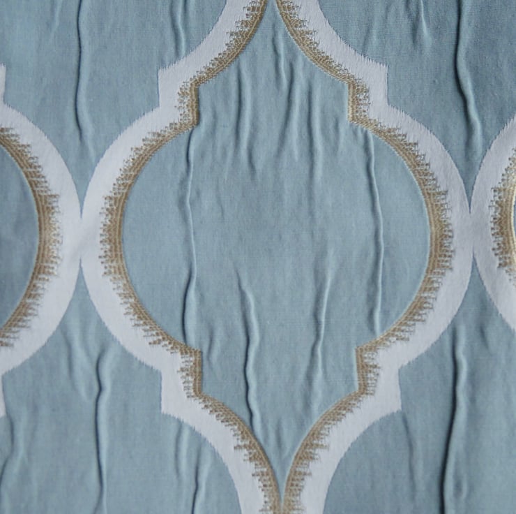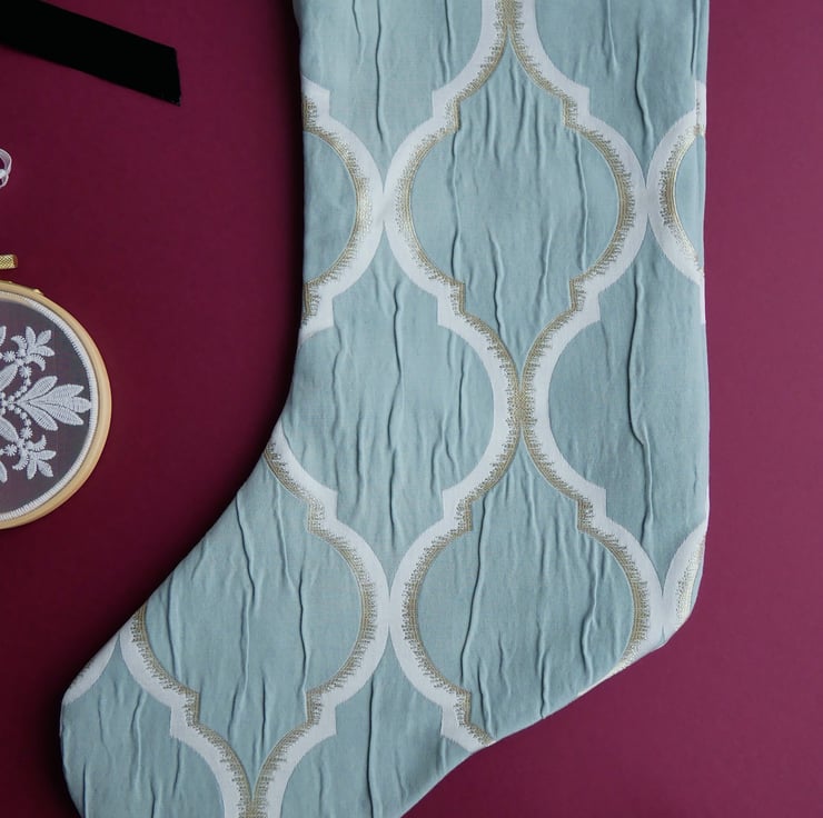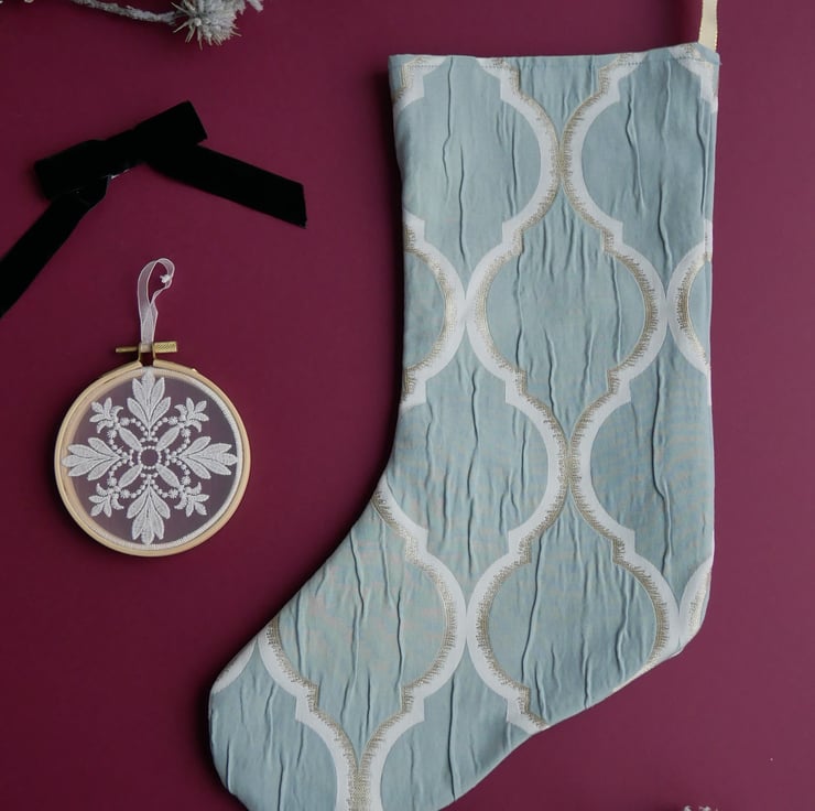 Christmas stocking in duck egg blue with a baroque style gold and white pattern.