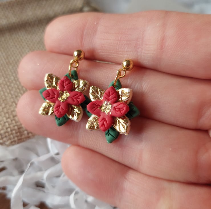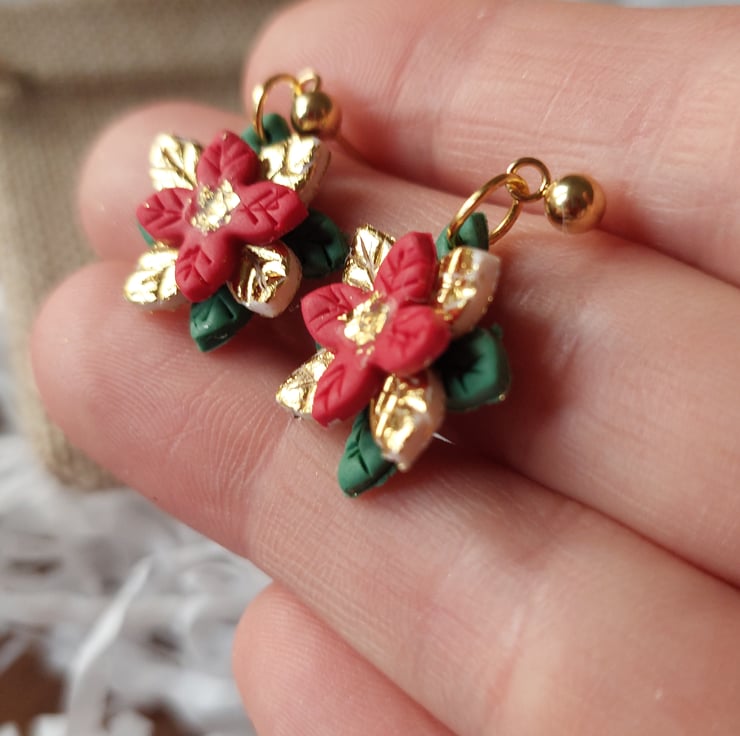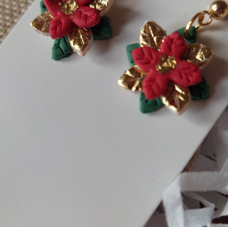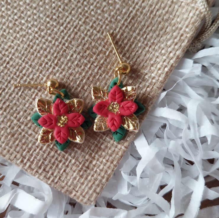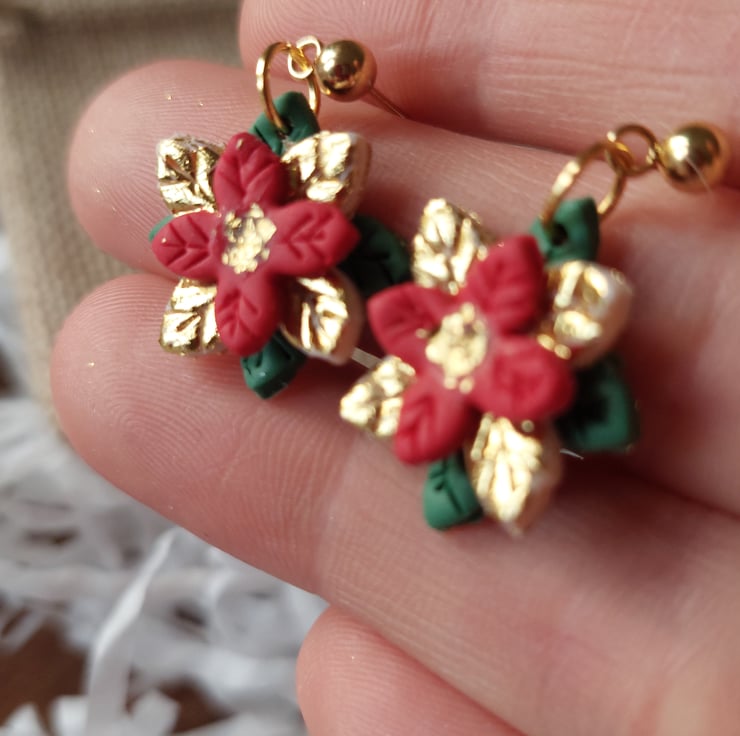 Made with polymer clay, these earrings have been cut with a poinsettia cutter, with the middle leaves and centre of the flower decorated with gold leaf.