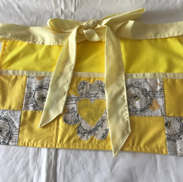 Bees Cotton Utility Apron, Yellow Tie Waist Three Pocket Patchwork, Handmade
