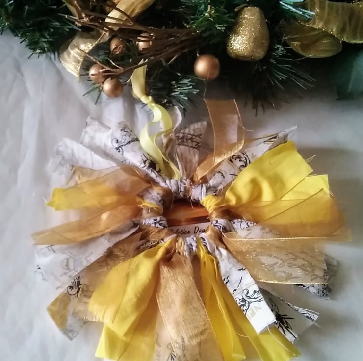 mini rag wreath made using cotton fabric scraps and ribbons wrapped around a metal curtain ring