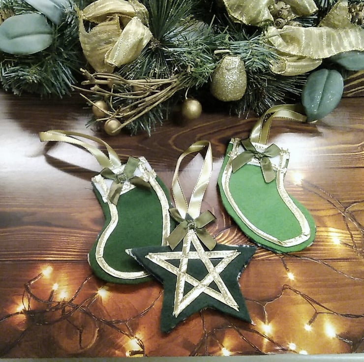 Christmas Tree Decoration, Stocking, Star Green and Gold Felt Ornament