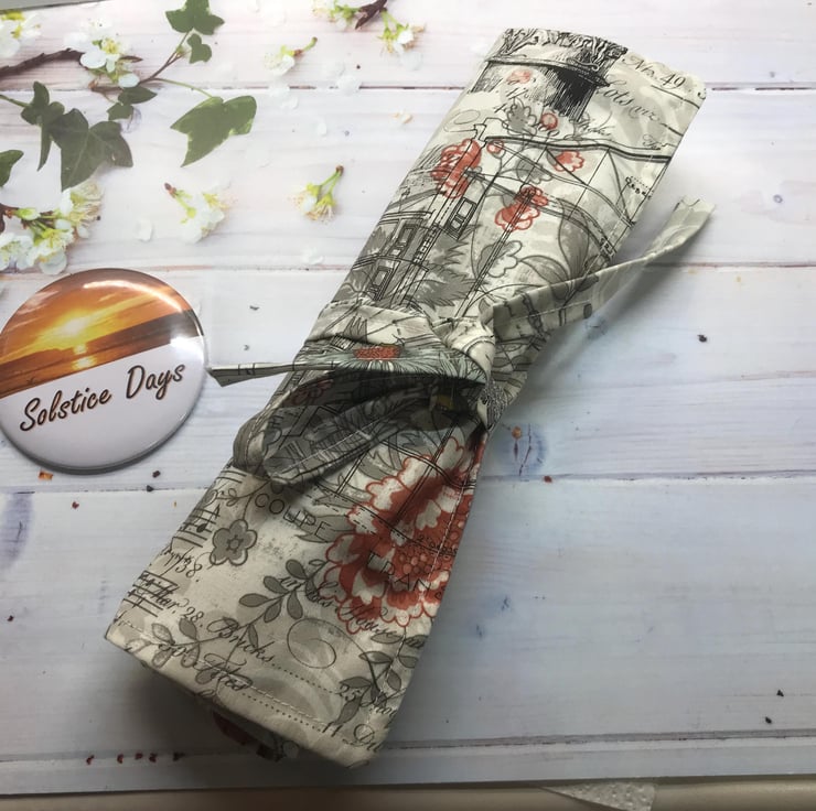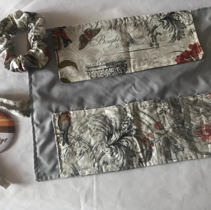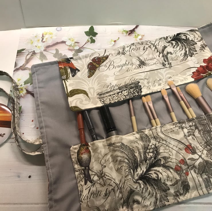This roll up make up case is just the perfect size to hold brushes and with fabric ties to keep the contents inside for easy storage.