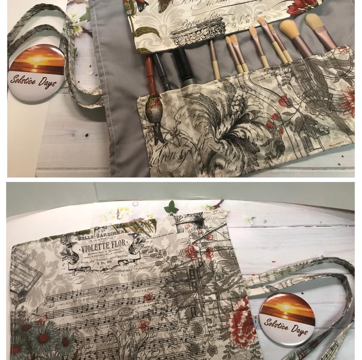 Musical script and flower print cotton fabric make up brush roll