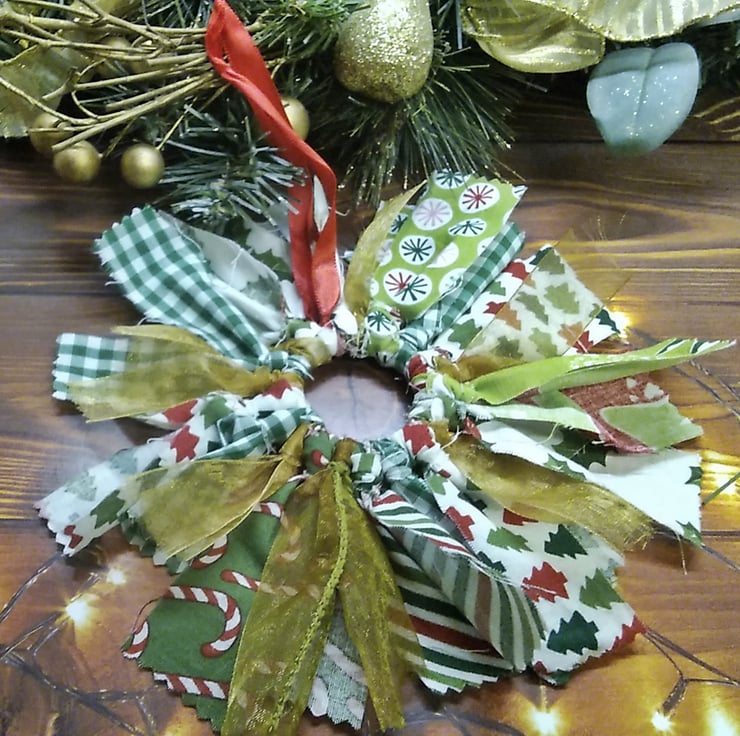 green and gold ribbon mini rag wreath fabric christmas decoration