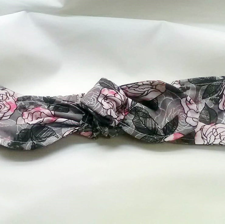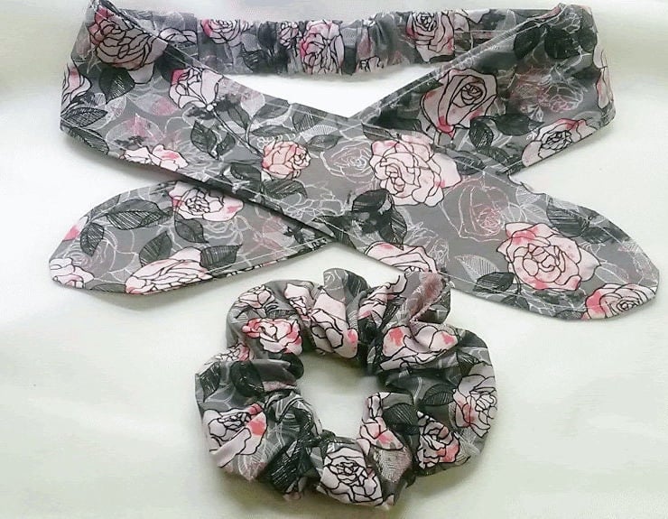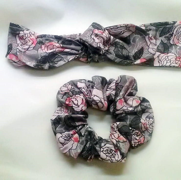 Grey and pink roses headband add matching scrunchie for a gift set