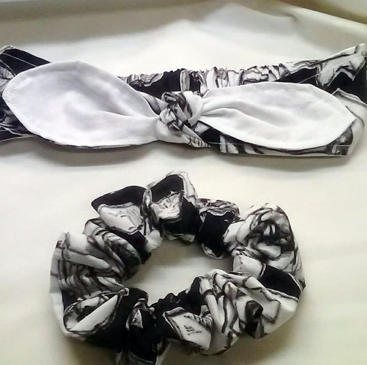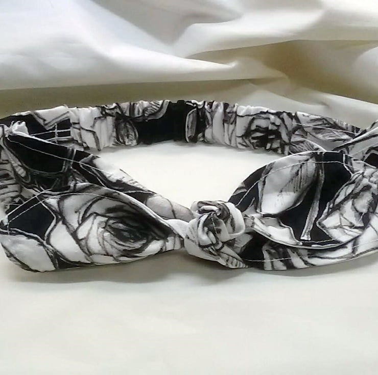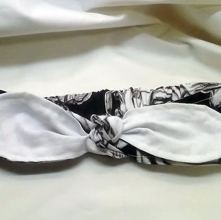 reversible headband left untied so you can adjust to fit with the elastic (6" inch long)