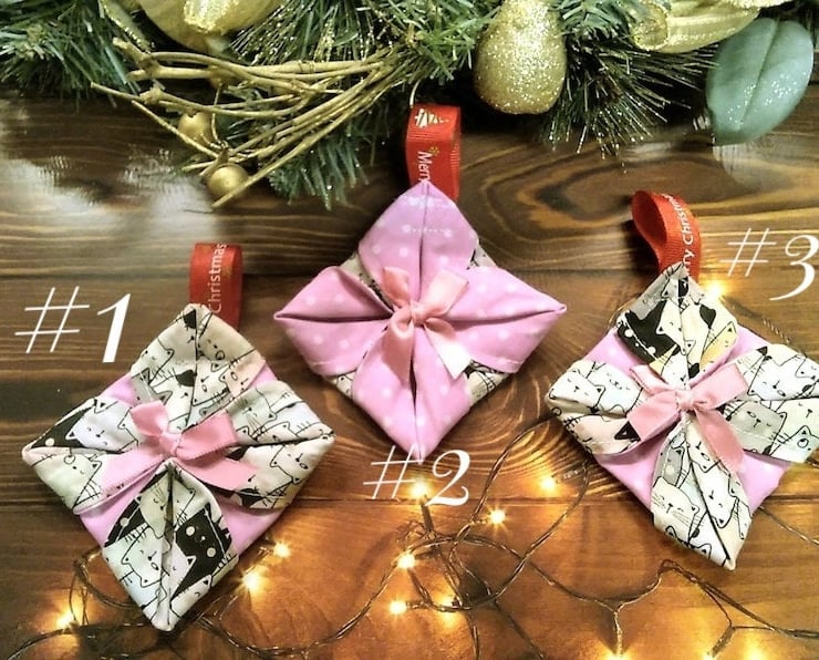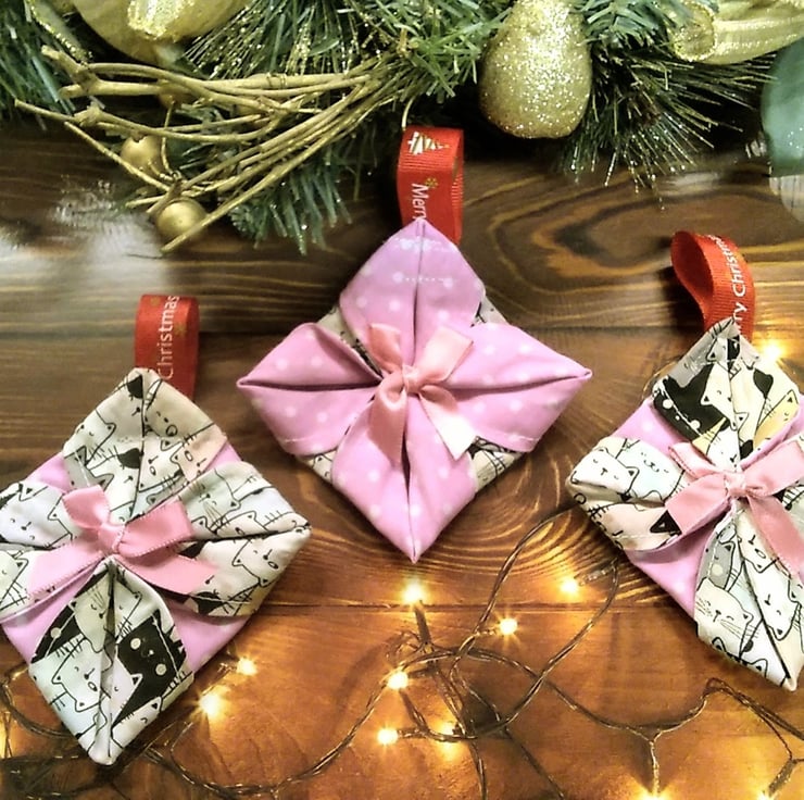 DETAILS : folded fabric christmas ornament with ribbon bow detail hand stitched to the front, red ribbon hanging loop