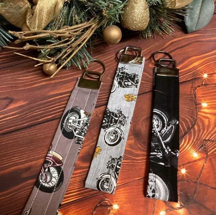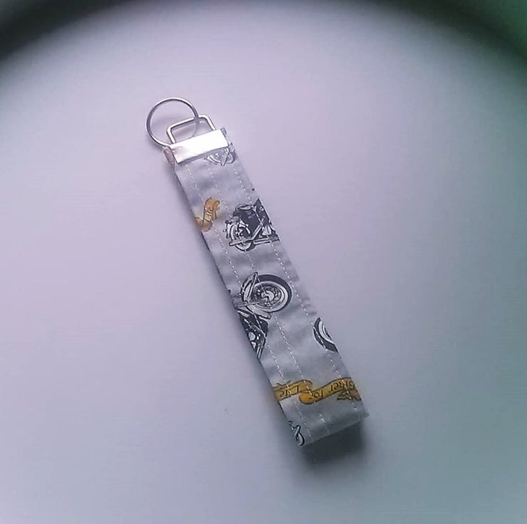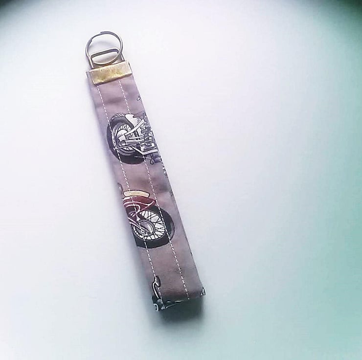 Detail - Wrist strap keyfob handmade using print cotton fabric with top stitched edges
