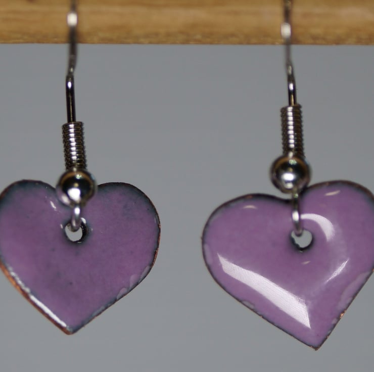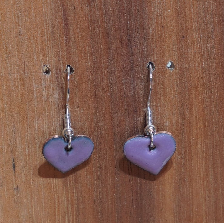 These heart shaped earrings are individually hand crafted from copper and enamelled with coloured glass powder. The earrings have been kiln fired with a counter enamel on the reverse for stability and strength.