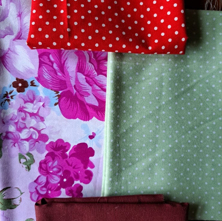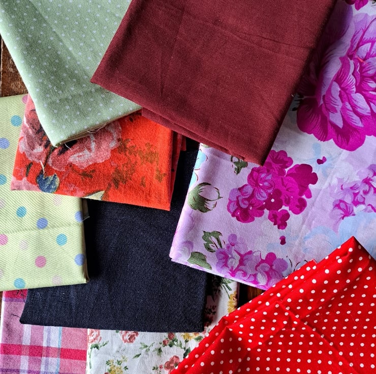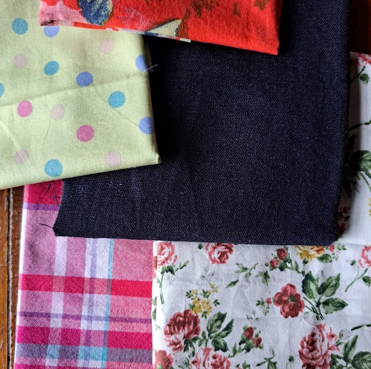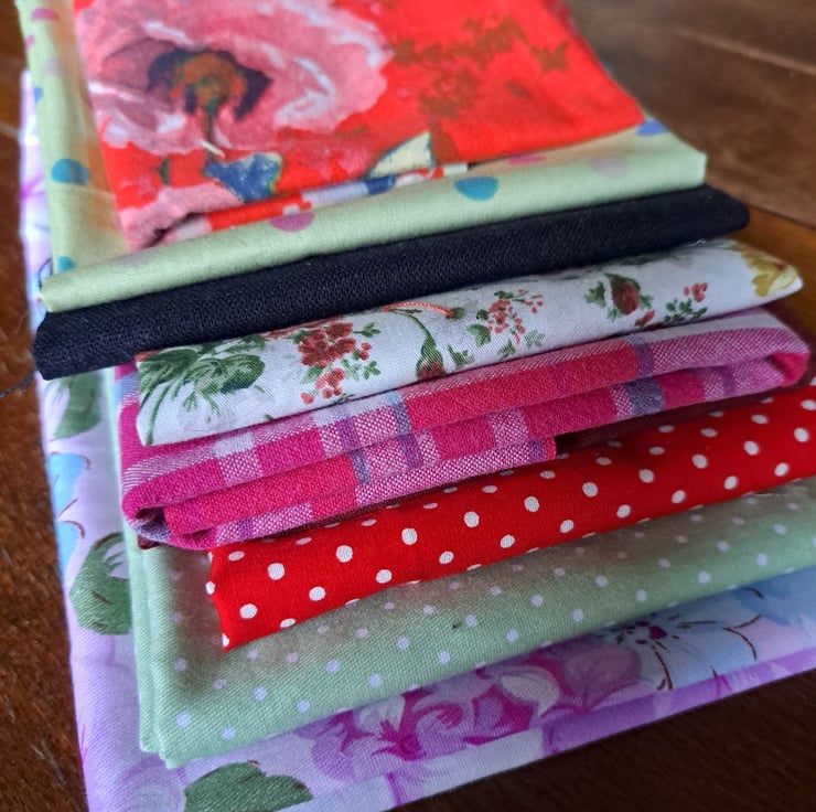 Nobody puts this bundle in the corner. Eight good sized pieces of cotton fabric (one is a deep indigo linen), with strong colours or bold designs. The largest - all budding pink peonies - measures 72cm by 40cm. New and repurposed pieces.