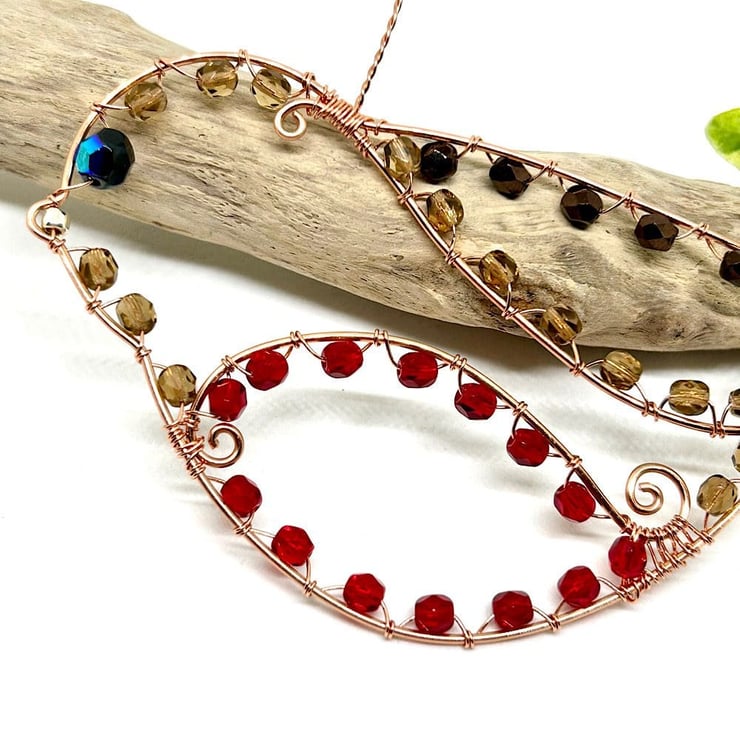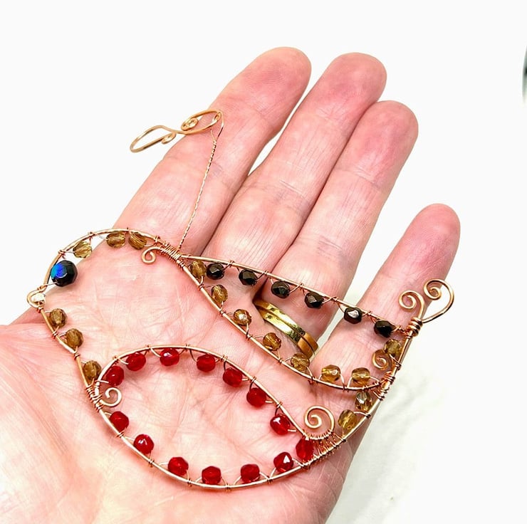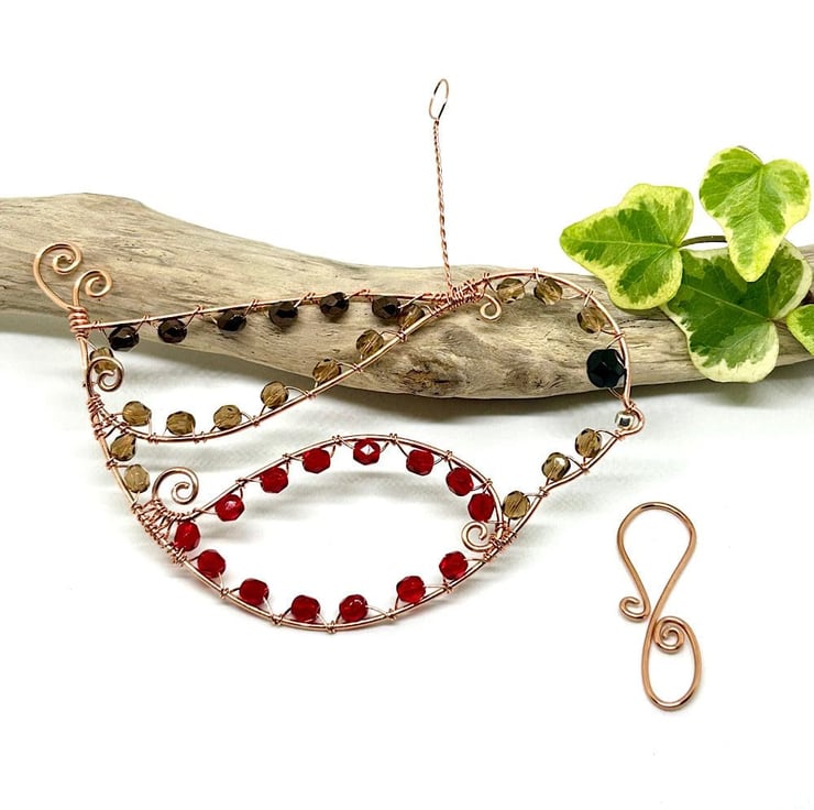 I have created a bird shape using copper wire with swirl details for the wing and tail feathers. Red, brown and bronze crystal beads are wrapped around the bird shape with a shiny gold bead for the beak and a black crystal bead for the eye. A hook is also included for hanging the decoration.