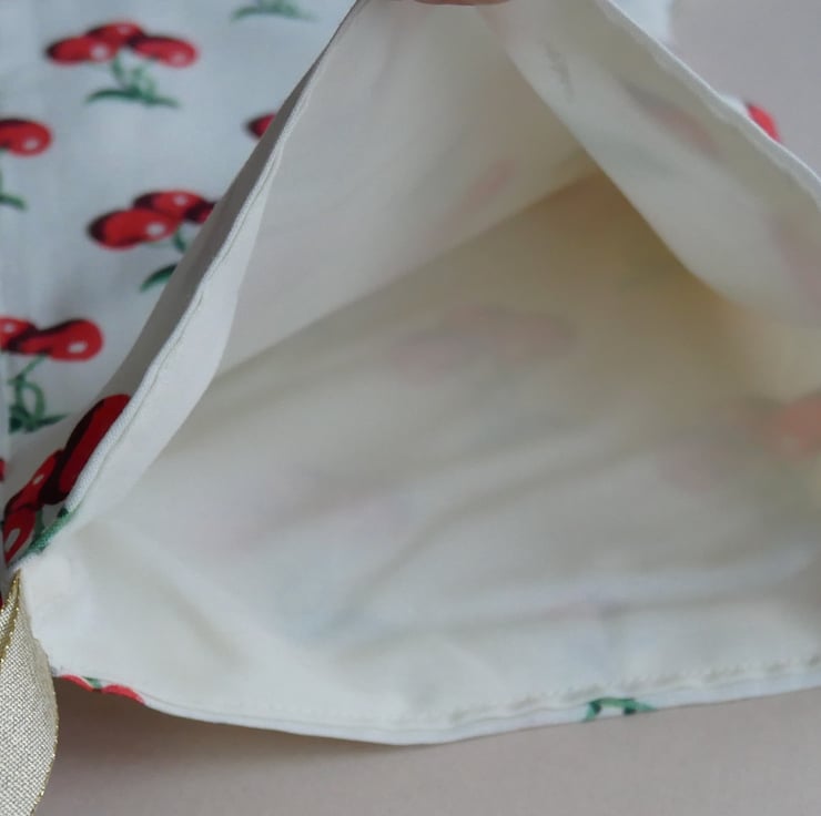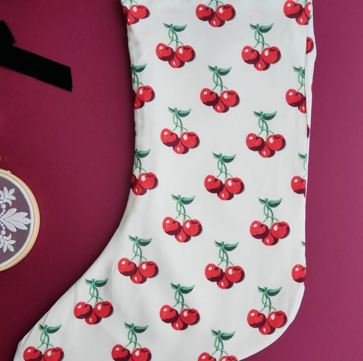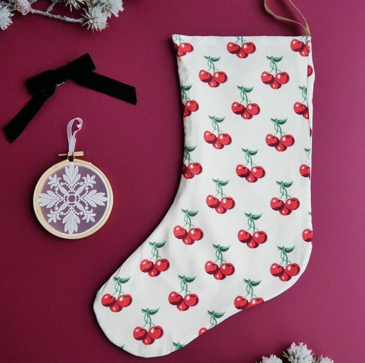 Cream Christmas stocking made with cream viscose linen fabric with a retro cherry print.