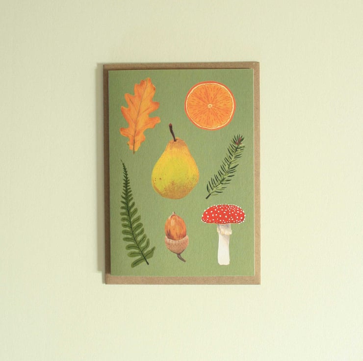 This greeting card features my botanical illustrations of autumnal treasures, including a pear, a mushroom, a fern leaf and an acorn on a green background.