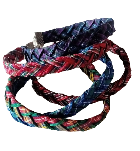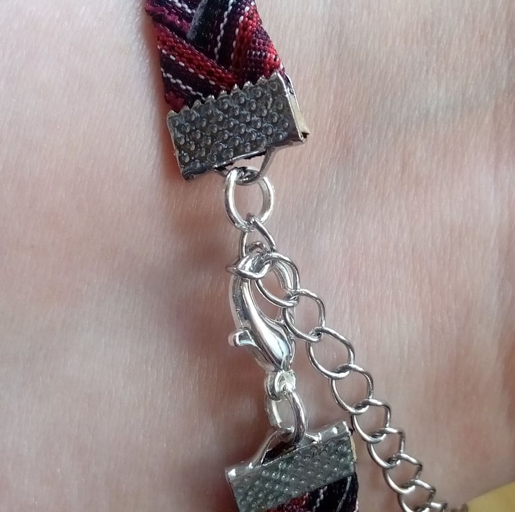 The band is made from three strands of polyester ribbon. The bracelet has a secure lobster clasp closure and extension chain. This will fit most adults.