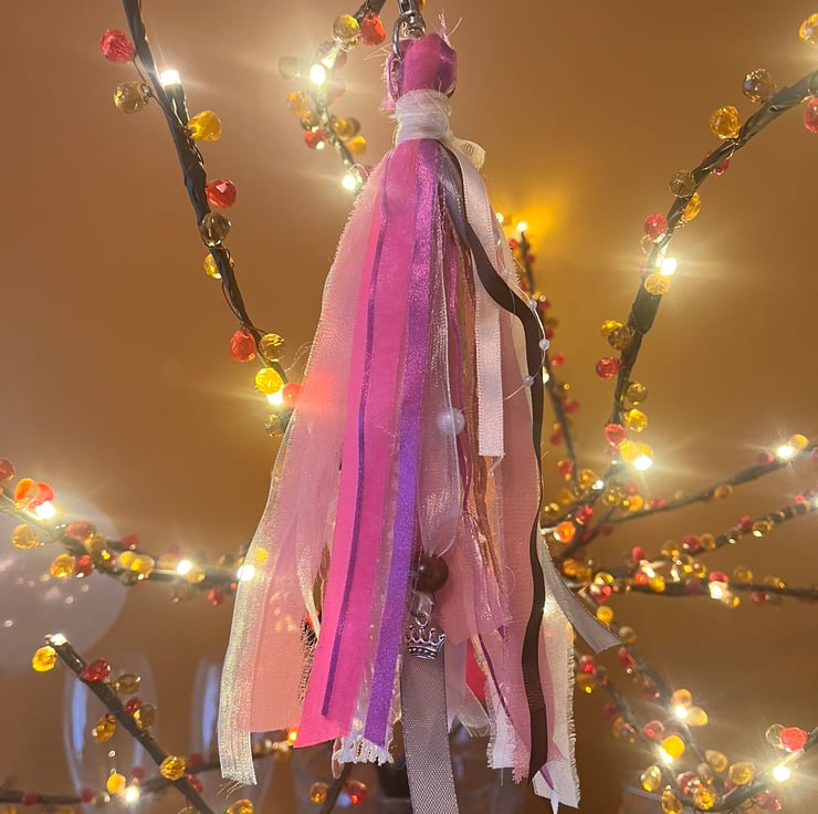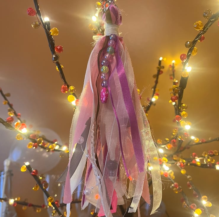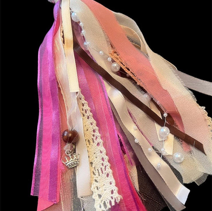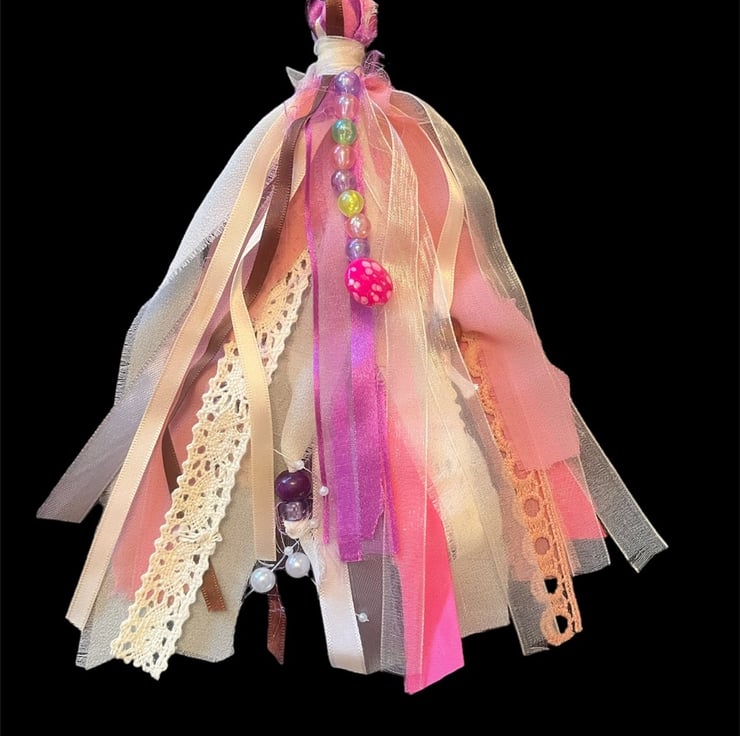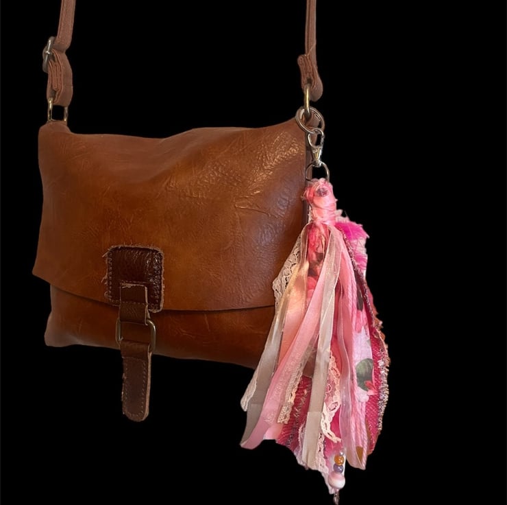 Make your Handbag or keys stand out from the rest with this pink themed fabric, lace, ribbon, beads and charm Shabby Chic Tassel. This clip on tassel is easy to use and can also be used as a tassel key ring. Maybe use it in a different way and hang it as a decoration. No matter where you put it, it will be sure to catch people’s attention.