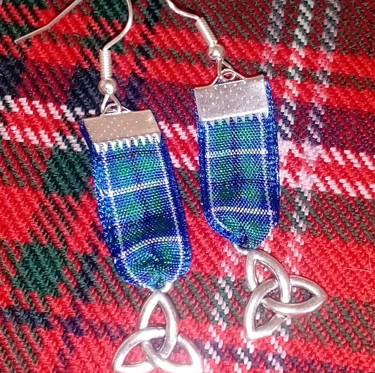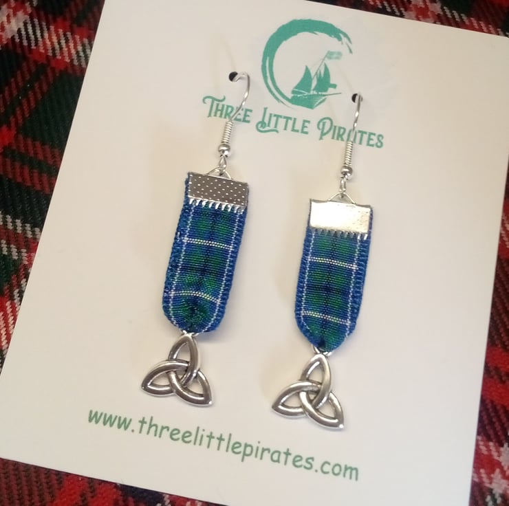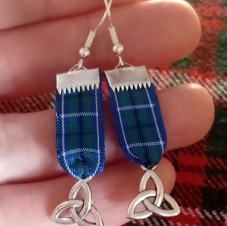 Lightweight ribbon earrings with silver coloured celtic knot charms. The earrings are a silver plated fishhook design.