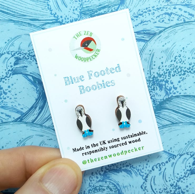 Wooden blue footed booby earrings designed by Carolyn and made in the UK using birch plywood from sustainable, responsibly managed woodlands.