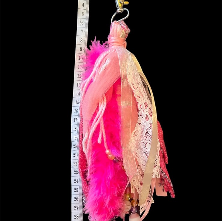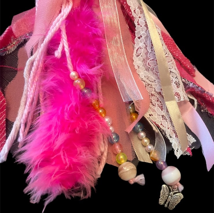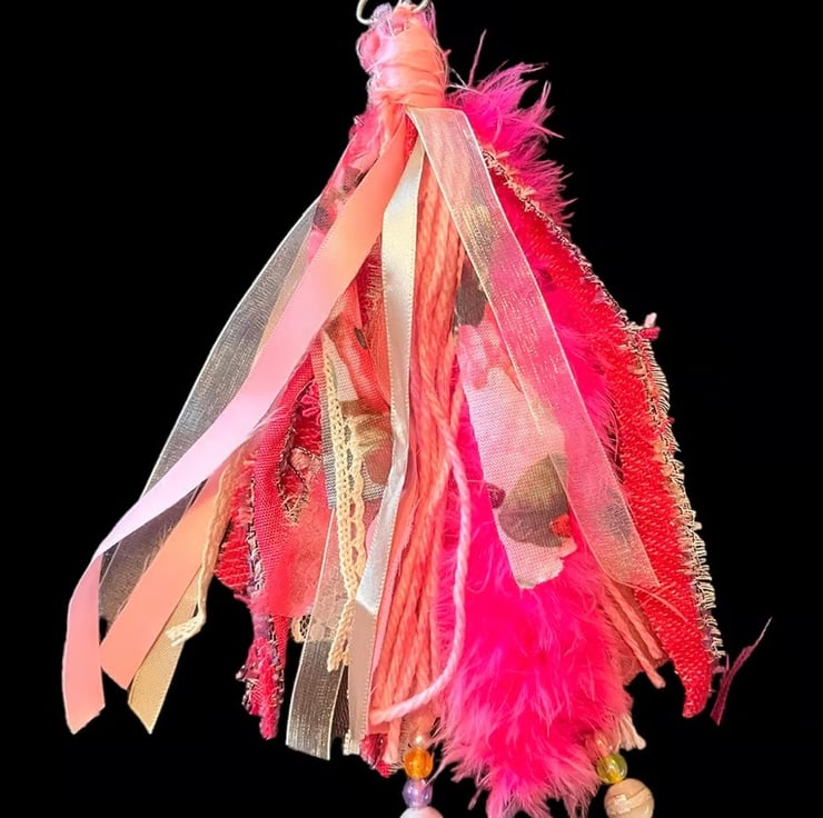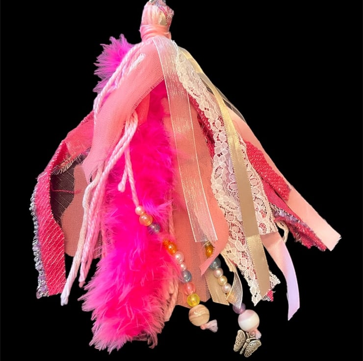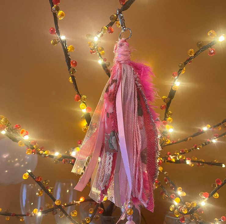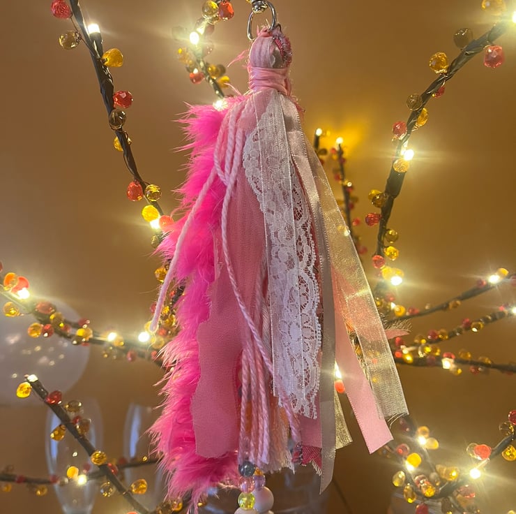 Another tassel in the shop that will make your Handbag or keys stand out from the rest with this pink themed feather boa, fabric, lace, ribbon, beads and charm Shabby Chic Boho Tassel.