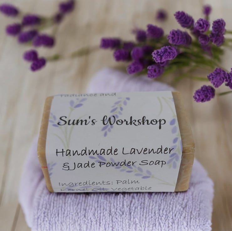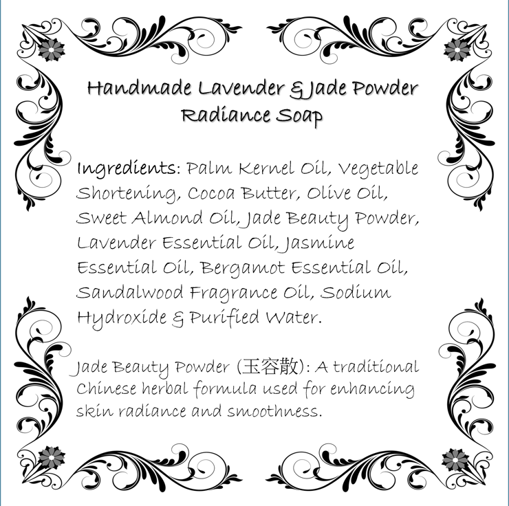Ingredients - Palm Kernel Oil, Vegetable Shortening, Cocoa Butter, Olive Oil, Sweet Almond Oil, Jade Beauty Powder, Lavender Essential Oil, Jasmine Essential Oil, Bergamot Essential Oil, Sandalwood Fragrance Oil, Sodium Hydroxide & Distilled Water.