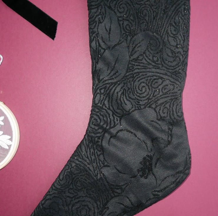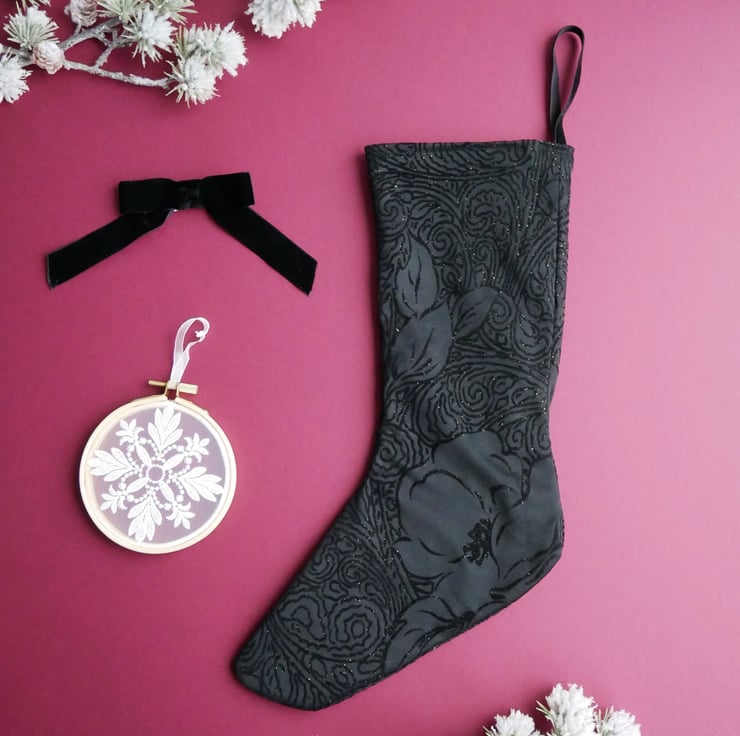 Black Christmas stocking with flocked poinsettia design and gold glitter effect.