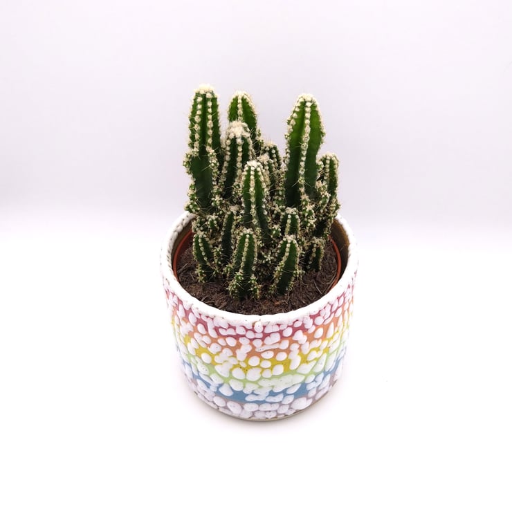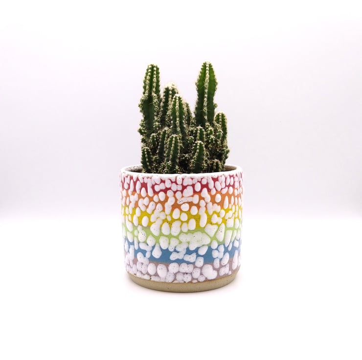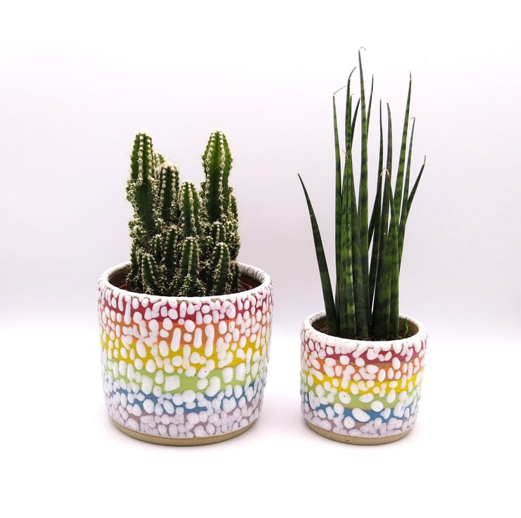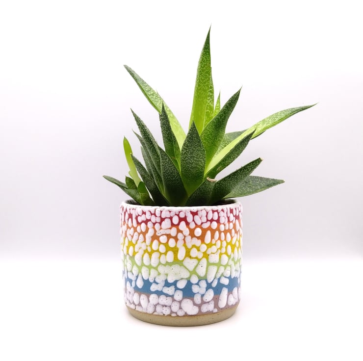 I throw my rainbow succulent planters on the potter's wheel and decorate them by hand using vibrant underglaze colours and white crawl glaze. Each planter is a one off due to them being handmade and because of the (exciting) unpredictable nature of the crawl glaze. I fire the planters to stoneware temperatures which means they are pretty tough and should last for many years to come! My regular planters will take a plant in a standard 9 cm plastic pot or plants can be potted directly into them. Each planter measures approx. 10.5 x 9 cm.