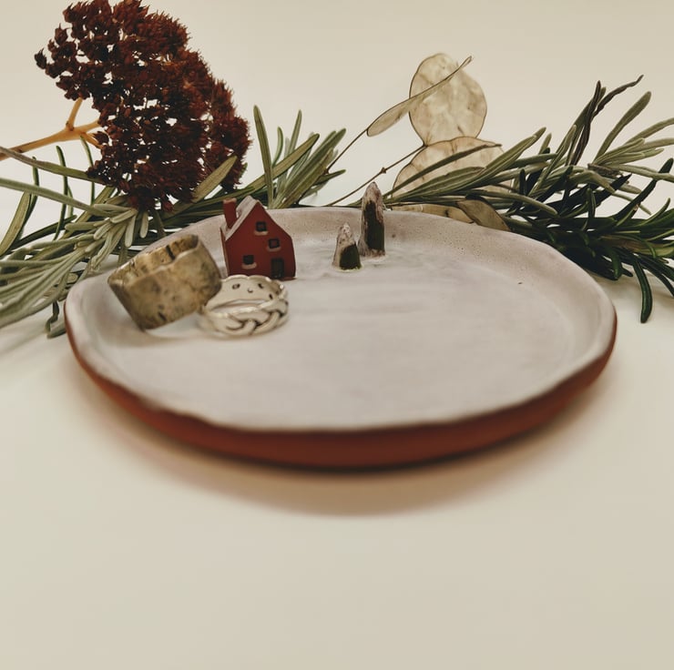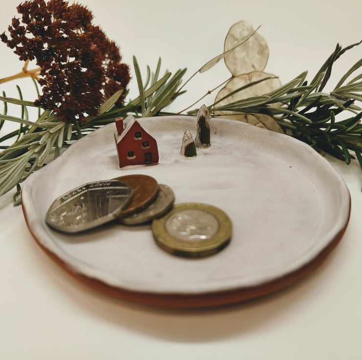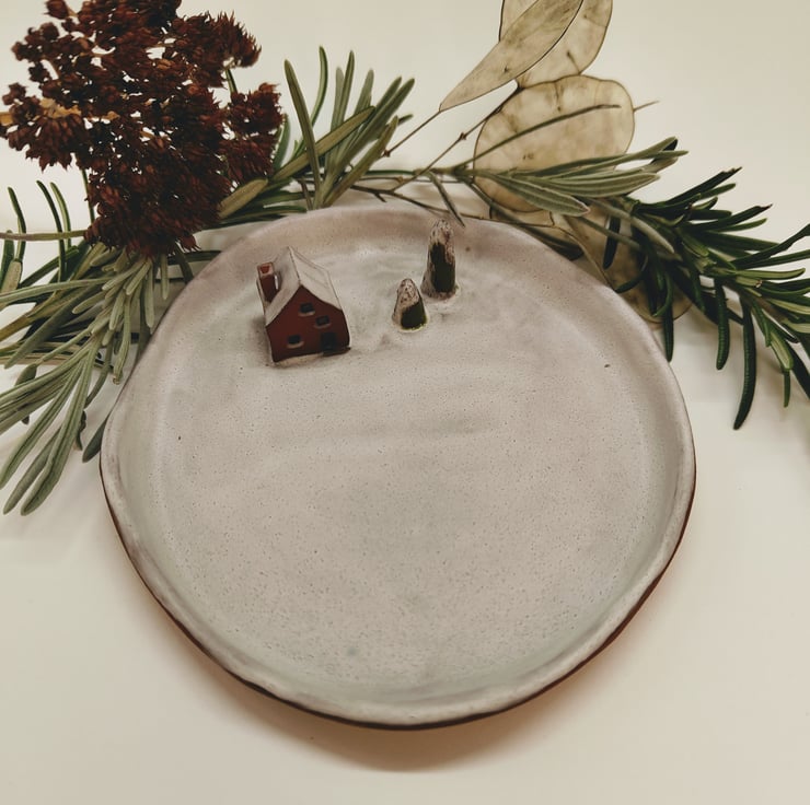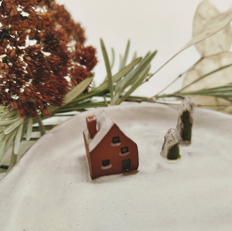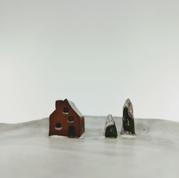 Ceramic dish with a little house and trees covered in a snow white glaze which contrast with the red brick colour of the house.