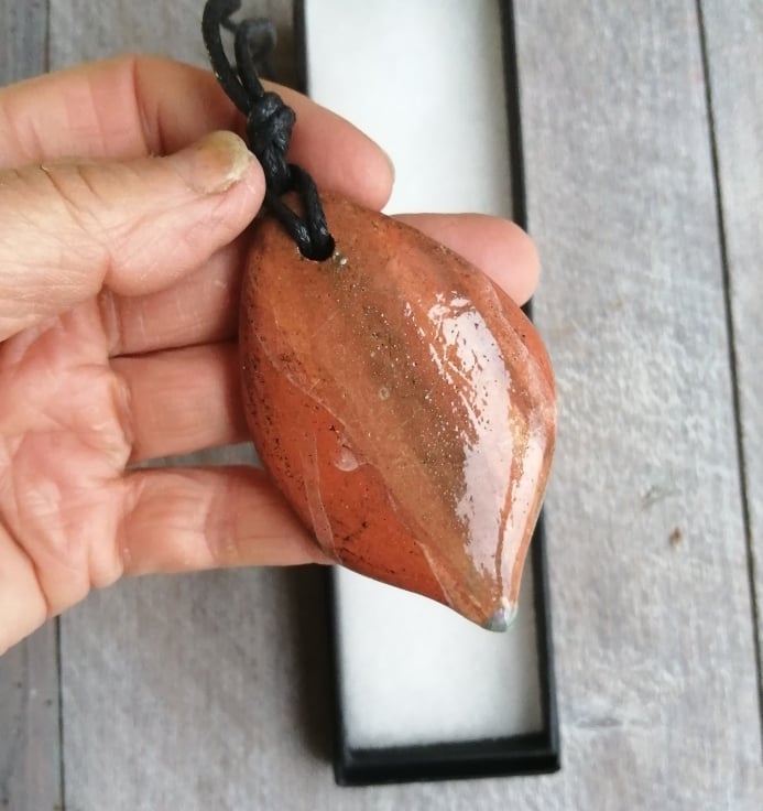 After drying, the pendants recieve a first firing to a high temperature to harden the clay, washes of natural occuring oxides are layered onto the pendant to enhance fine details, then dipped into a clear glaze, giving a very smooth and tactile finish on both sides, after the second time in the kiln.