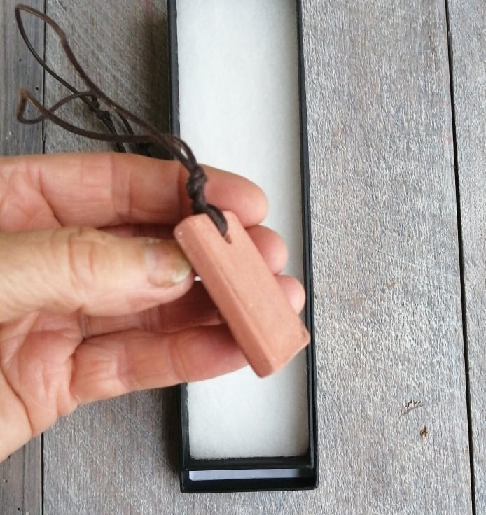 Coming with a sturdy, attractive present box made from recycled materials from the Tiny Box Company, this unique piece of jewelry measures 4.5 cm long and 3 cm across with a depth of 6 mm, when worn the chord length will hang at approx 38 cm.